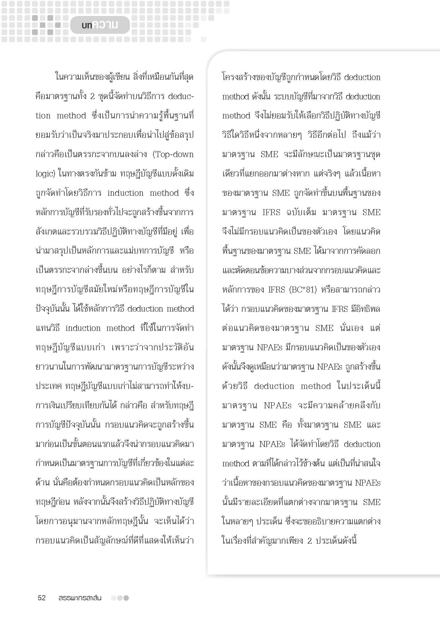 ตามที่สภาวิชาชีพบัญชีได้มีประกาศให้ถอนร่างมาตรฐานการบัญชีสำหรับกิจการขนาดกลางและขนาดย่อม (มาตรฐาน SME) เพื่อนำกลับมาทบทวน ปรับปรุงเนื้อหาและขอบเขตให้เหมาะสมกับสภาพแวดล้อมของประเทศไทย จึงส่งผลให้การบังคับใช้มาตรฐานฉบับนี้ยังคงเลื่อนออกไปก่อน ผู้เขียนต้องขอนับถือการตัดสินใจในครั้งนี้ จุดมุ่งหมายของบทความนี้ก็เพื่อจะทำให้ผู้อ่านเข้าใจถึงเหตุผลที่กล่าวเช่นนั้นในการพิจารณาความสัมพันธ์ระหว่างหลักการของภาษีเงินได้นิติบุคคลกับบัญชีการเงิน ถือว่ามีความสัมพันธ์ที่ใกล้ชิดกันอย่างยิ่ง แม้แต่ในระบบของสหรัฐอเมริกา ที่เป็นที่รู้จักกันดีว่าเป็นประเทศที่ยอมรับในความแตกต่างระหว่างบัญชีภาษีอากรกับบัญชีการเงิน ยังมีแบบฟอร์มเพื่อยื่นเสียภาษีเงินได้นิติบุคคล (ฟอร์ม 1120) ที่จัดเตรียมจากข้อมูลในงบการเงิน สำหรับประเทศไทยนั้นข้อมูลที่ต้องใช้ในการกรอกแบบ ภ.ง.ด.50 ก็มาจากข้อมูลในงบการเงินเช่นกัน โดยเฉพาะอย่างยิ่งจากงบกำไรขาดทุน สำหรับในประเทศไทย กิจการขนาดกลางและขนาดย่อม หรือเรียกอีกอย่างหนึ่งคือ บริษัทเอกชนทั่วไปที่ไม่ใช่บริษัทมหาชน จะต้องใช้มาตรฐาน NPAEs ในการจัดทำบัญชี มองจากภายนอกมาตรฐาน NPAEs อาจจะดูเหมือนกับมาตรฐาน SME แต่มาตรฐานทั้งสองมีความแตกต่างกันอย่างมากทีเดียว ยกตัวอย่างสิ่งที่เหมือนกัน เช่น คำจำกัดความของ “สินค้าคงเหลือ” เนื้อหาของมาตรฐาน NPAEs (ย่อหน้า 86 ของมาตรฐาน NPAEs) เหมือนกับมาตรฐาน SME นอกจากนี้ มาตรฐาน NPAEs ในหลายๆ ย่อหน้าได้คัดลอกหรือตัดทอนมาจากมาตรฐาน SMEในความเห็นของผู้เขียน สิ่งที่เหมือนกันที่สุดคือมาตรฐานทั้ง 2 ชุดนี้จัดทำบนวิธีการ deduction method ซึ่งเป็นการนำความรู้พื้นฐานที่ยอมรับว่าเป็นจริงมาประกอบเพื่อนำไปสู่ข้อสรุป กล่าวคือเป็นตรรกะจากบนลงล่าง (Top-down logic) ในทางตรงกันข้าม ทฤษฎีบัญชีแบบดั้งเดิมถูกจัดทำโดยวิธีการ induction method  ซึ่งหลักการบัญชีที่รับรองทั่วไปจะถูกสร้างขึ้นจากการสังเกตและรวบรวมวิธีปฏิบัติทางบัญชีที่มีอยู่ เพื่อนำมาสรุปเป็นหลักการและแม่บทการบัญชี หรือเป็นตรรกะจากล่างขึ้นบน อย่างไรก็ตาม สำหรับทฤษฎีการบัญชีสมัยใหม่หรือทฤษฎีการบัญชีในปัจจุบันนั้น ได้ใช้หลักการวิธี deduction method แทนวิธี induction method ที่ใช้ในการจัดทำทฤษฎีบัญชีแบบเก่า เพราะว่าจากประวัติอันยาวนานในการพัฒนามาตรฐานการบัญชีระหว่างประเทศ ทฤษฎีบัญชีแบบเก่าไม่สามารถทำให้งบการเงินเปรียบเทียบกันได้ กล่าวคือ สำหรับทฤษฎีการบัญชีปัจจุบันนั้น กรอบแนวคิดจะถูกสร้างขึ้นมาก่อนเป็นขั้นตอนแรกแล้วจึงนำกรอบแนวคิดมากำหนดเป็นมา